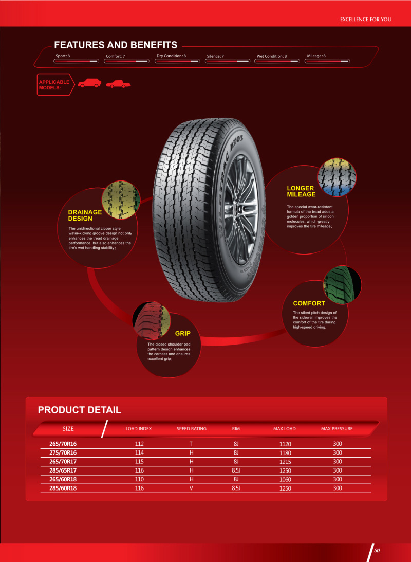一款優(yōu)秀的全地形輪胎,突破性技術(shù)塑造胎面結(jié)構(gòu),對各自路況具有良好的適應(yīng)能力。